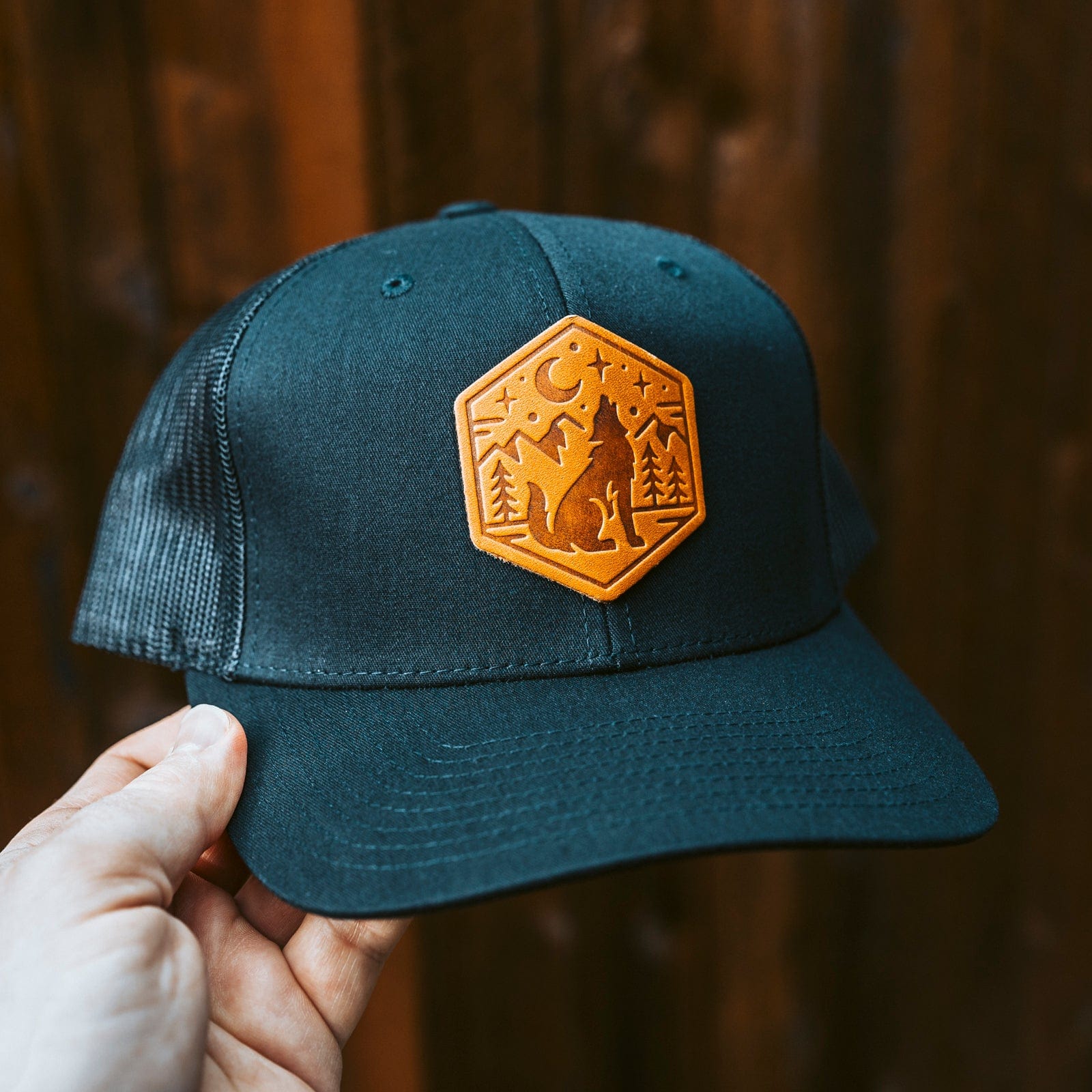This hat isn't just a piece of apparel; it's a call to the wild, a nod to those who thrive under the stars. Featuring a stunning, handcrafted leather patch depicting a wolf in mid-howl against the backdrop of the night, this cap captures the essence of freedom and the call of adventure.