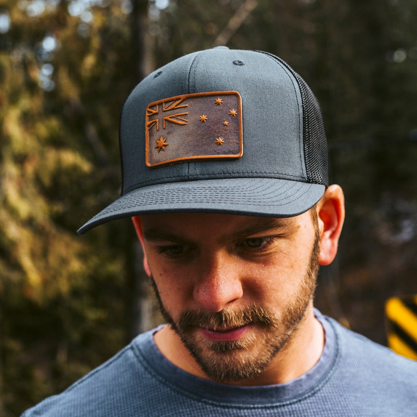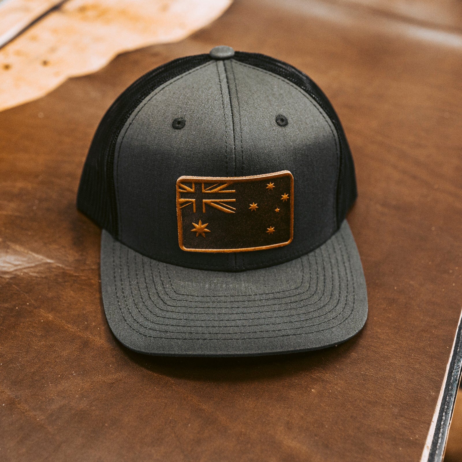 The cap presents a tribute to Australian heritage with a beautifully crafted leather patch that features the iconic Southern Cross and Union Jack, symbols of the Australian flag. The deep, earthy tones of the leather patch resonate with Australia's rugged landscapes, while the meticulous stitching pays homage to the enduring Aussie spirit.