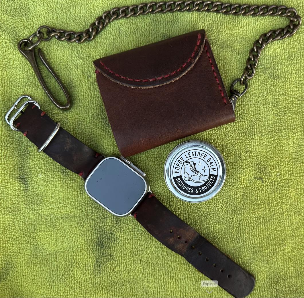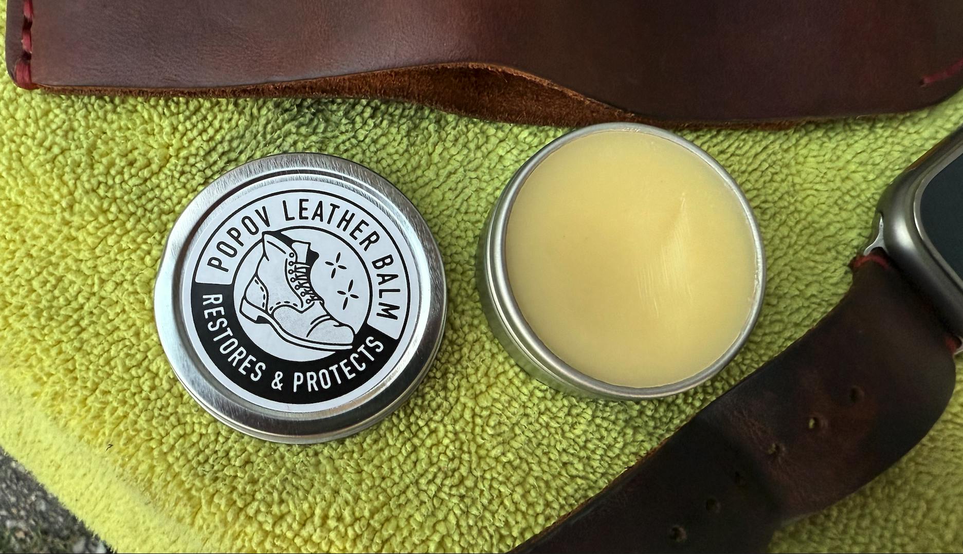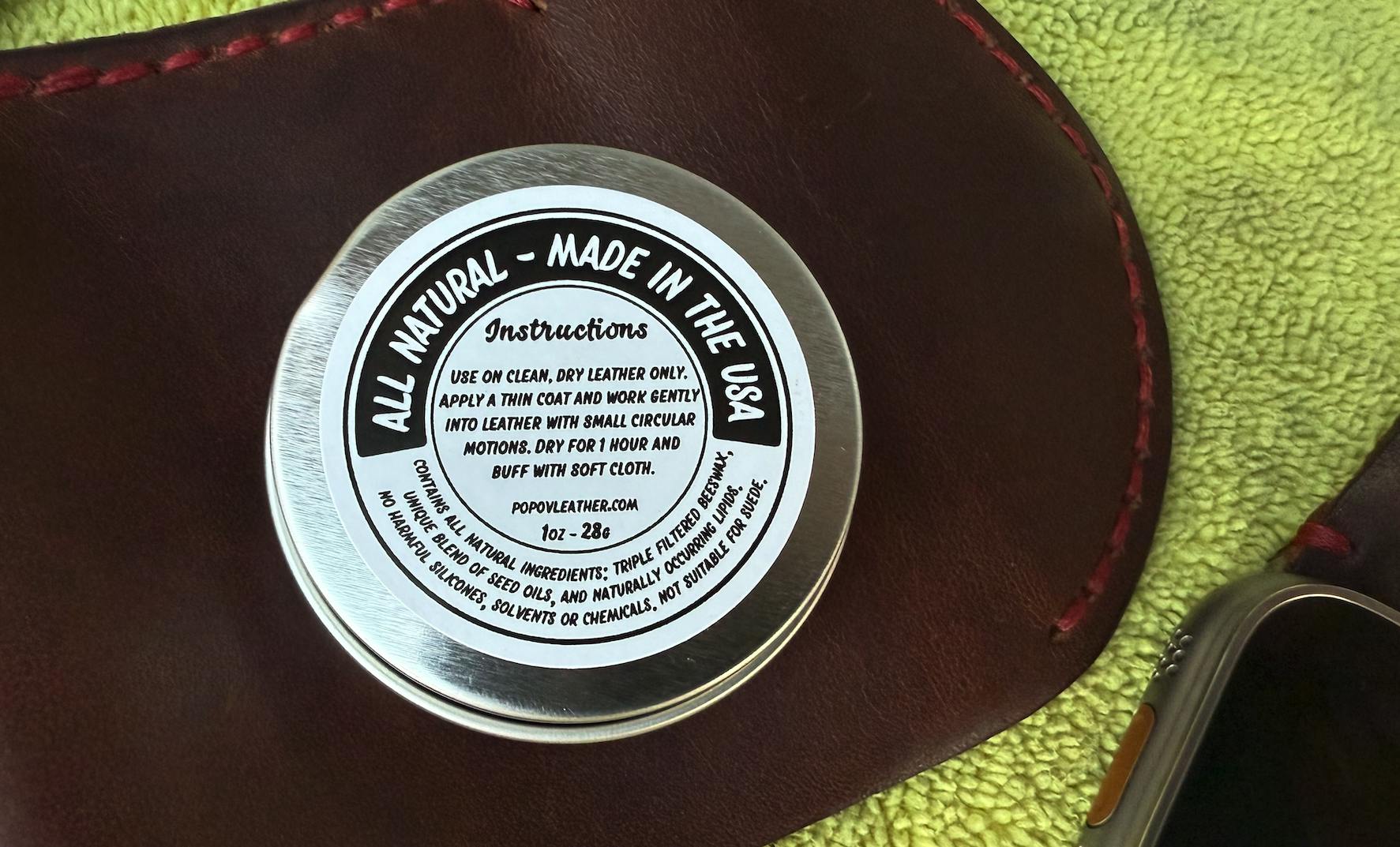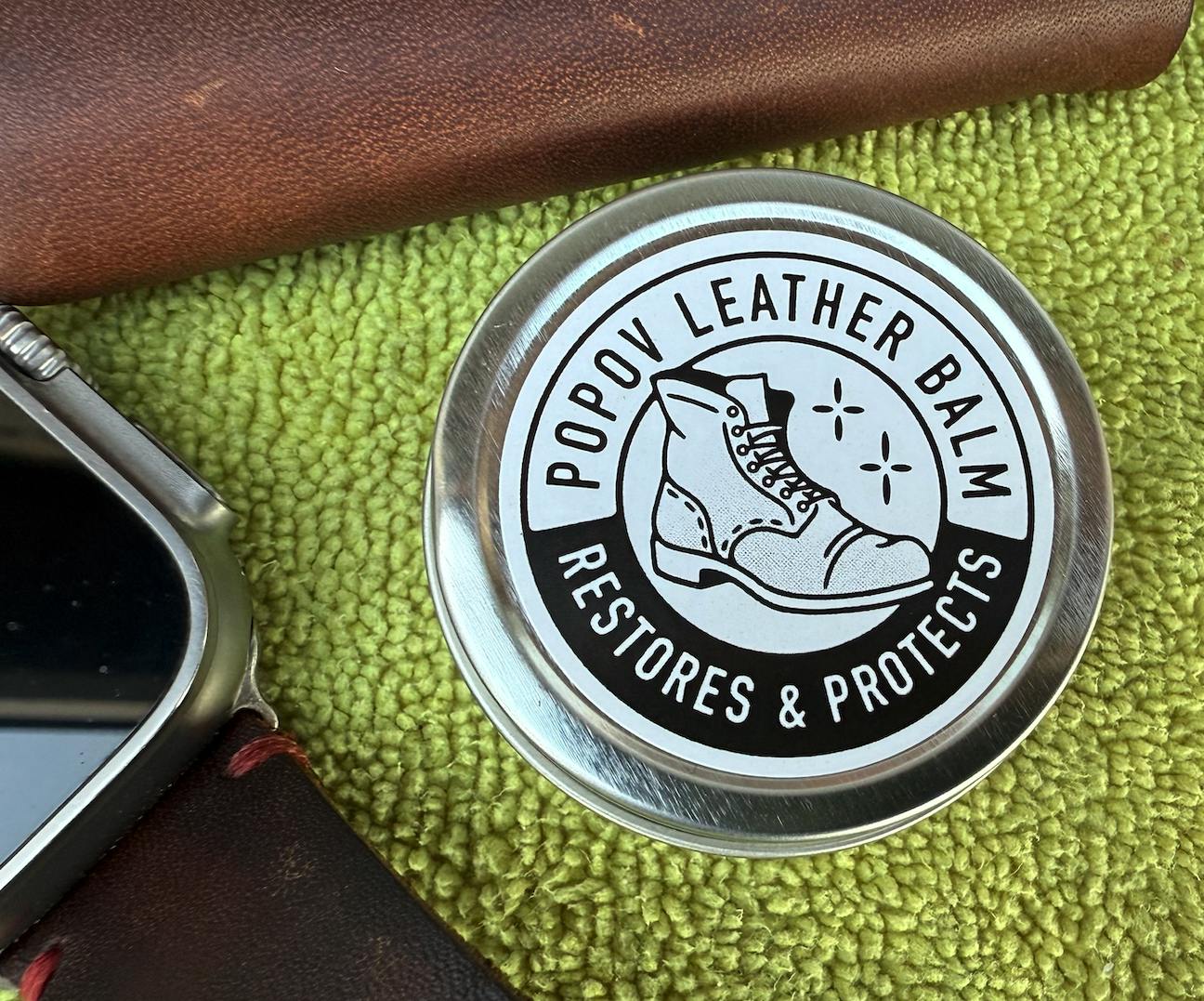 - Apply a very small amount of Popov Leather Balm onto a lint-free cloth. Rub the balm into your leather goods in a circular motion.