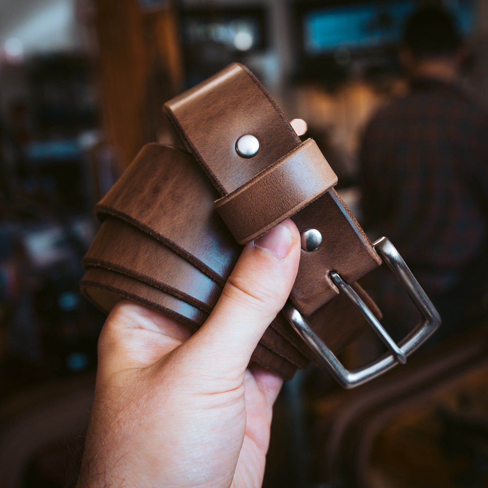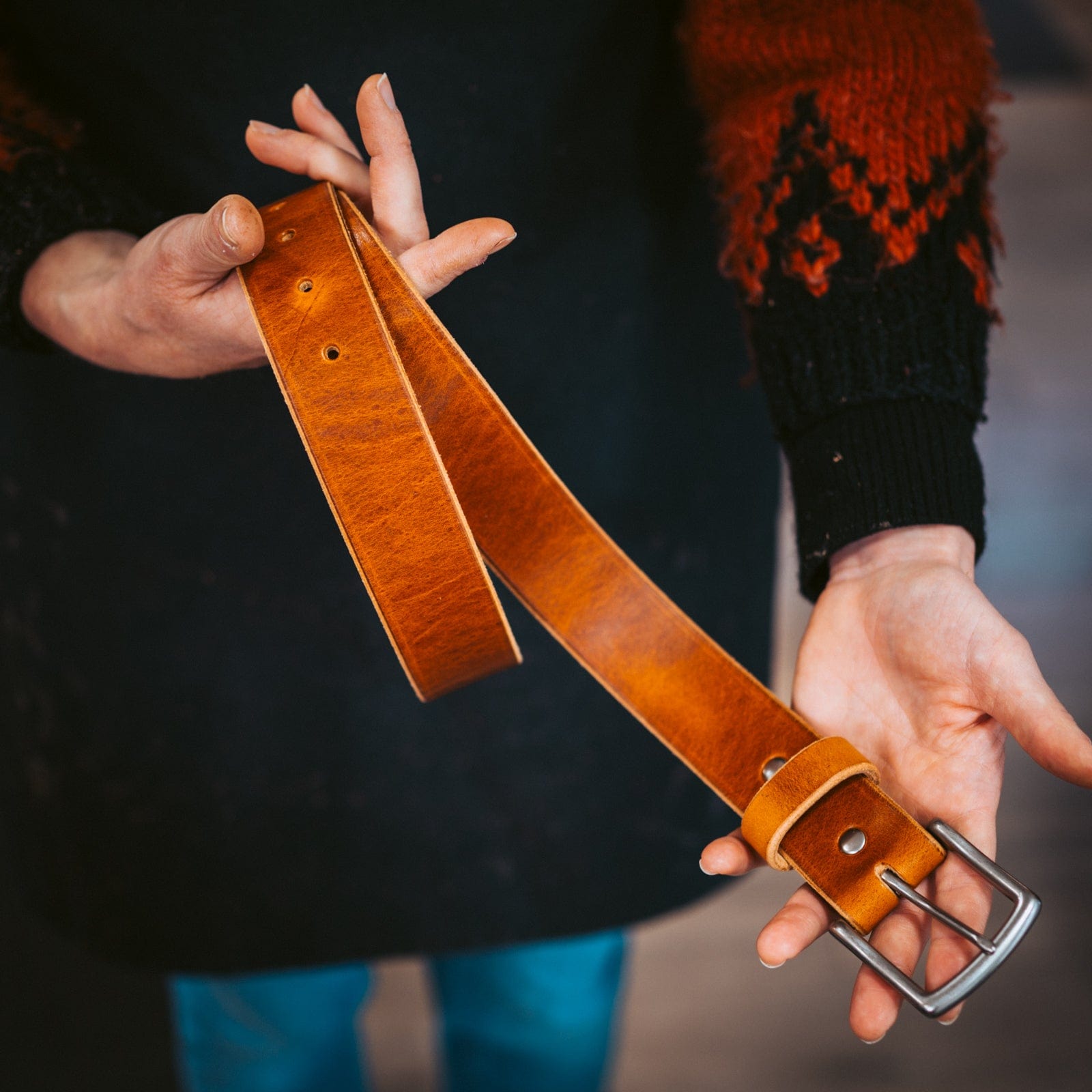 Our full-grain leather develops a rich patina and fits better over time. We take the time to burnish and polish every belt edge – this adds refinement and allows the strap to pass smoothly through your hands. Finally, a solid brass buckle offers a comforting weight and keeps your pants where you want them.