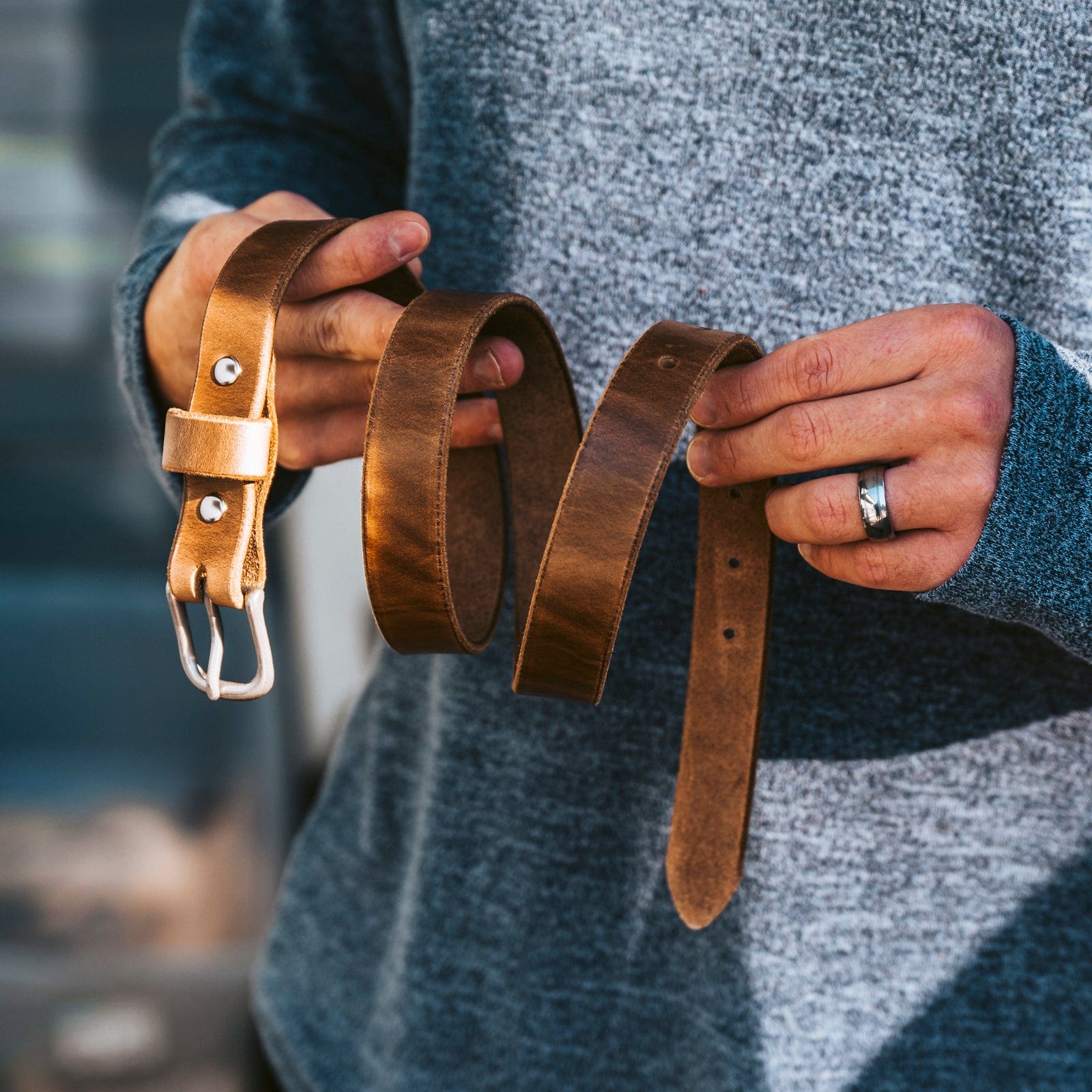 We make this belt from top-quality full-grain leather. It's tough but will get more comfortable and look better as you wear it.