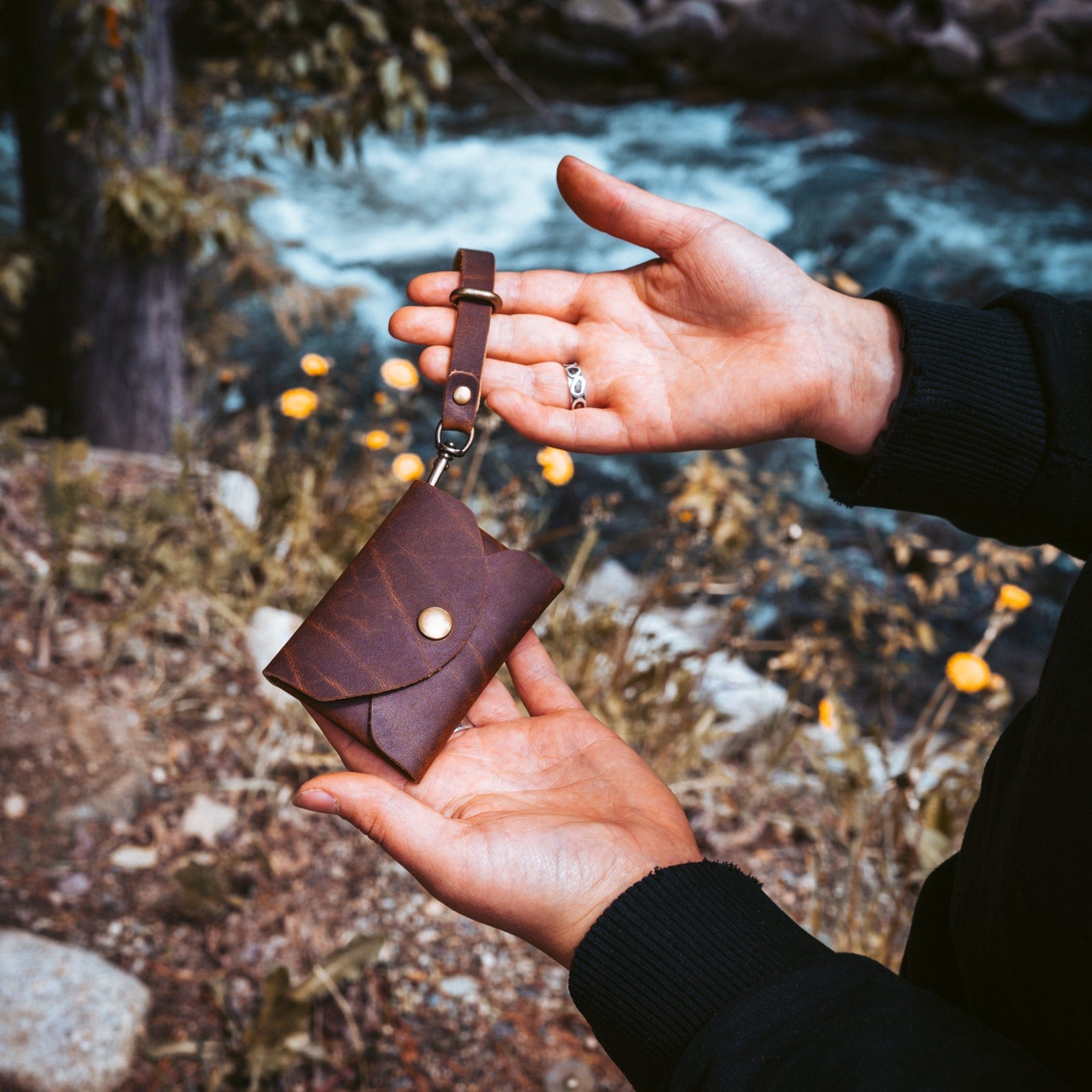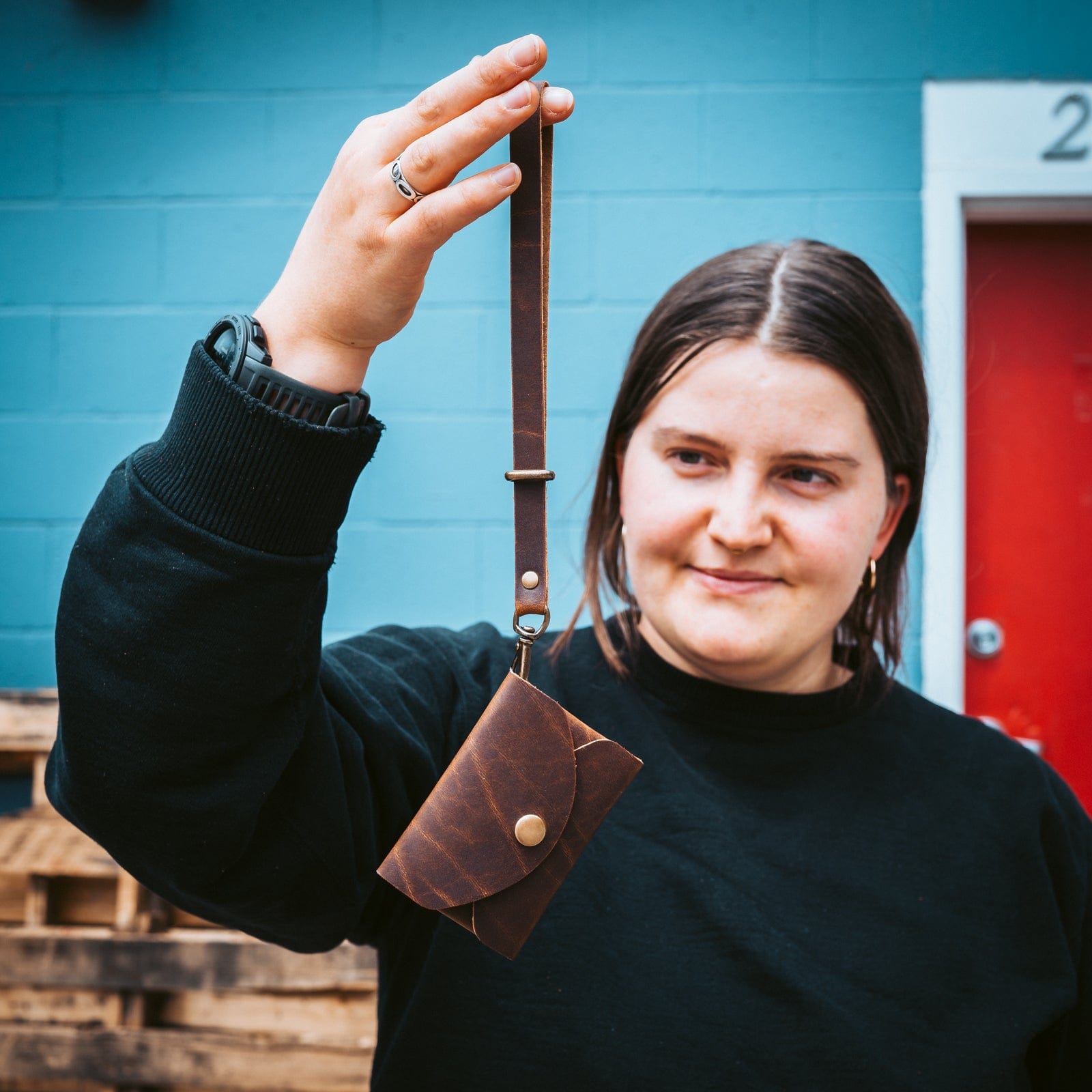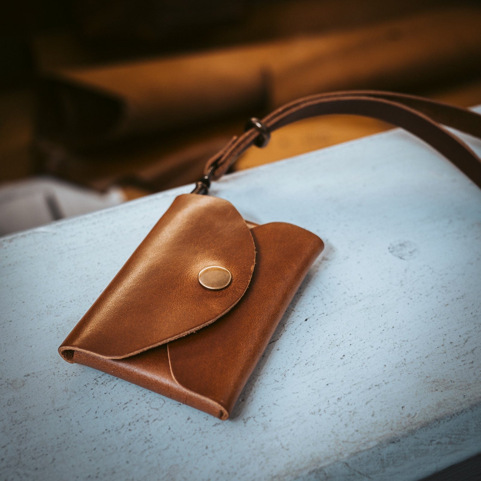 Built from the same full-grain leather we use for everything else, this envelope will age and develop character over time. The detachable wristlet gives you options—clip it to your keys or carry it on its own. A brass snap keeps your cards secure. There are no unnecessary features; just what you need.