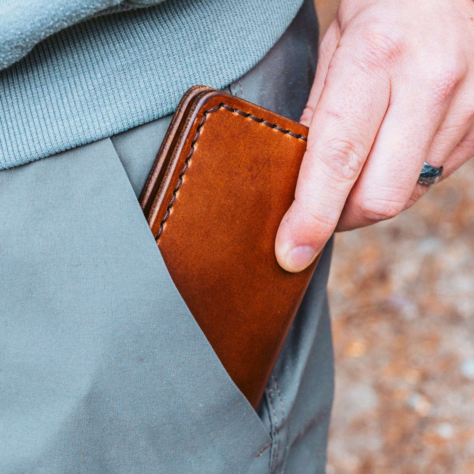 Our full-grain leather means your wallet will develop character and patina. We hand-sew this wallet with thick polyester thread so it will never unravel or come apart. The wallet features a convenient front pocket for quick access to your go-to card. Our minimalist design allows you to carry all your essential cards and cash without the bulk. We take a lot of pride in our work and back each wallet with a lifetime guarantee.