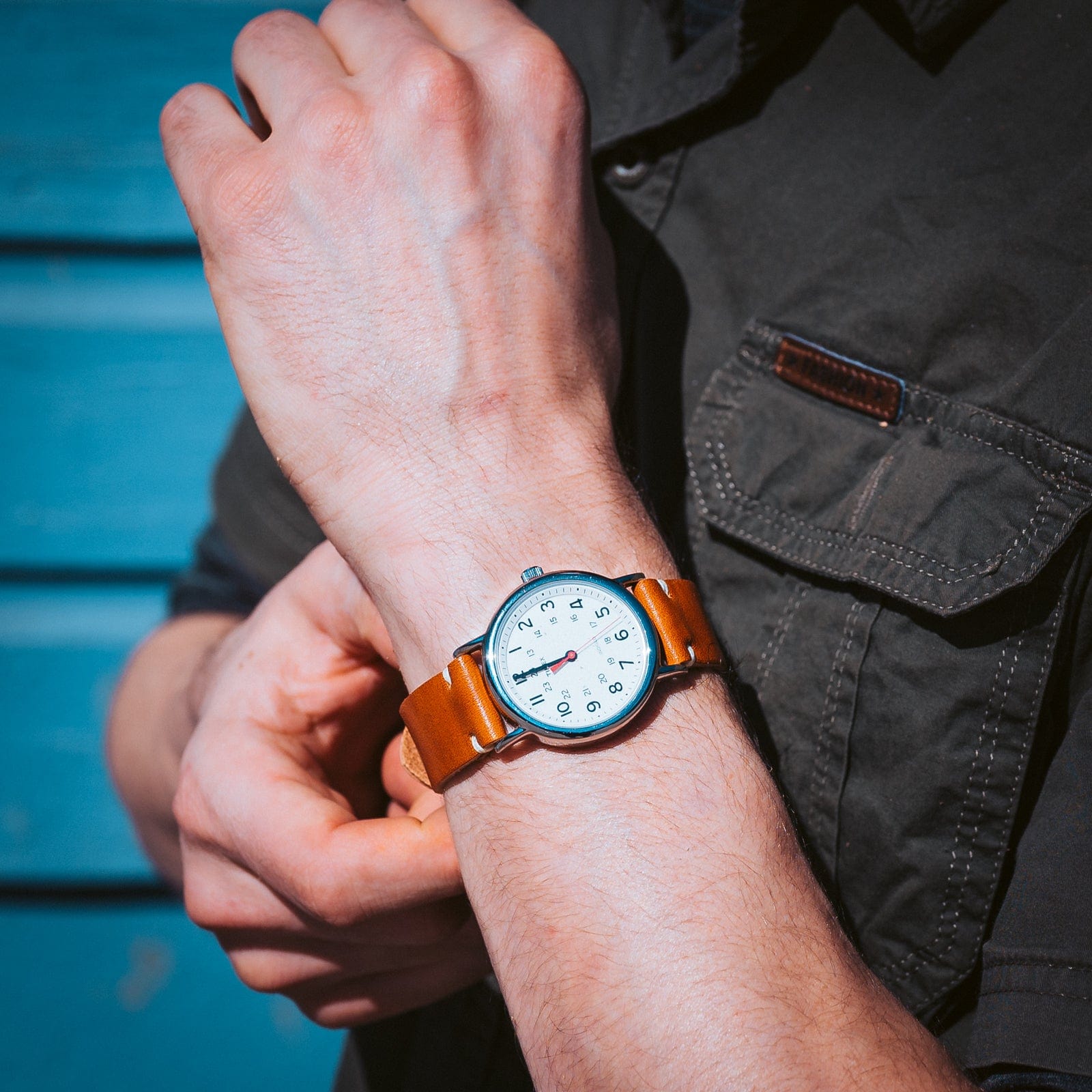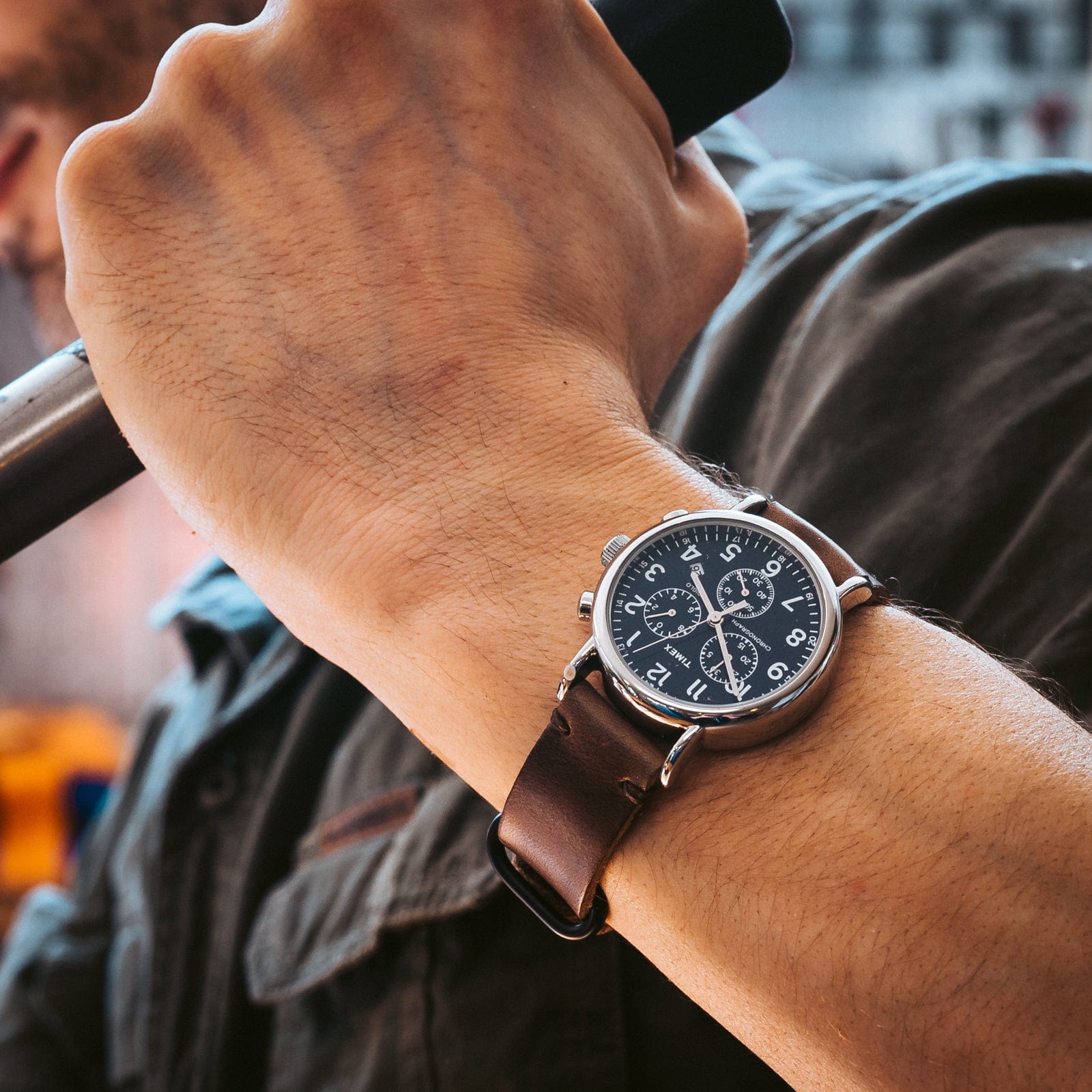 With an average-size timepiece, straps are designed to fit wrist circumference between 6" and 8.5". We measured our straps using the Timex Weekender pictured.